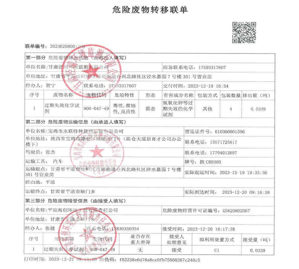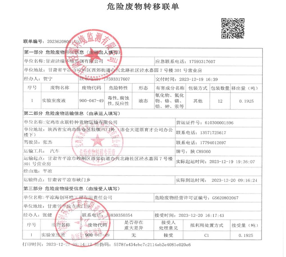 根據(jù)《中華人民共和國固體廢物污染環(huán)境防治法》(2020年9月1日修訂)的相關規(guī)定,甘肅涇瑞環(huán)境監(jiān)測有限公司依法及時公開固體廢物污染環(huán)境防治信息,主動接受社會監(jiān)督。